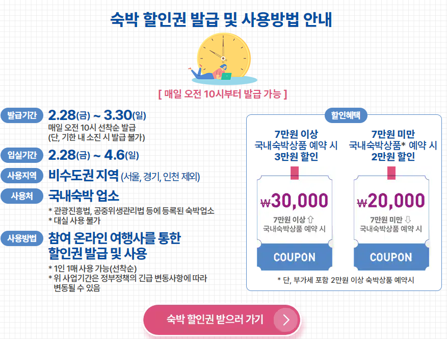 할인권은 2월 28일부터 매일 오전 10시, 총 42개 OTA(온라인 여행사)에서 선착순 발급됩니다.