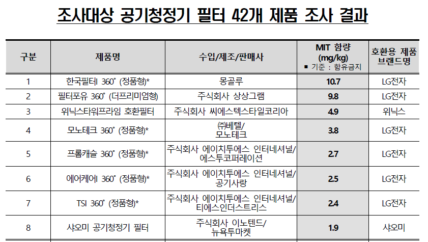 한국소비자원이 환경부, 한국환경산업기술원과 함께 2024년 시중에 유통된 공기청정기 필터 42개 제품을 조사했는데요, 그중 호환용 필터 8개 제품에서 금지된 가습기 살균제 성분(MIT)이 검출됐다고 해요. 😱